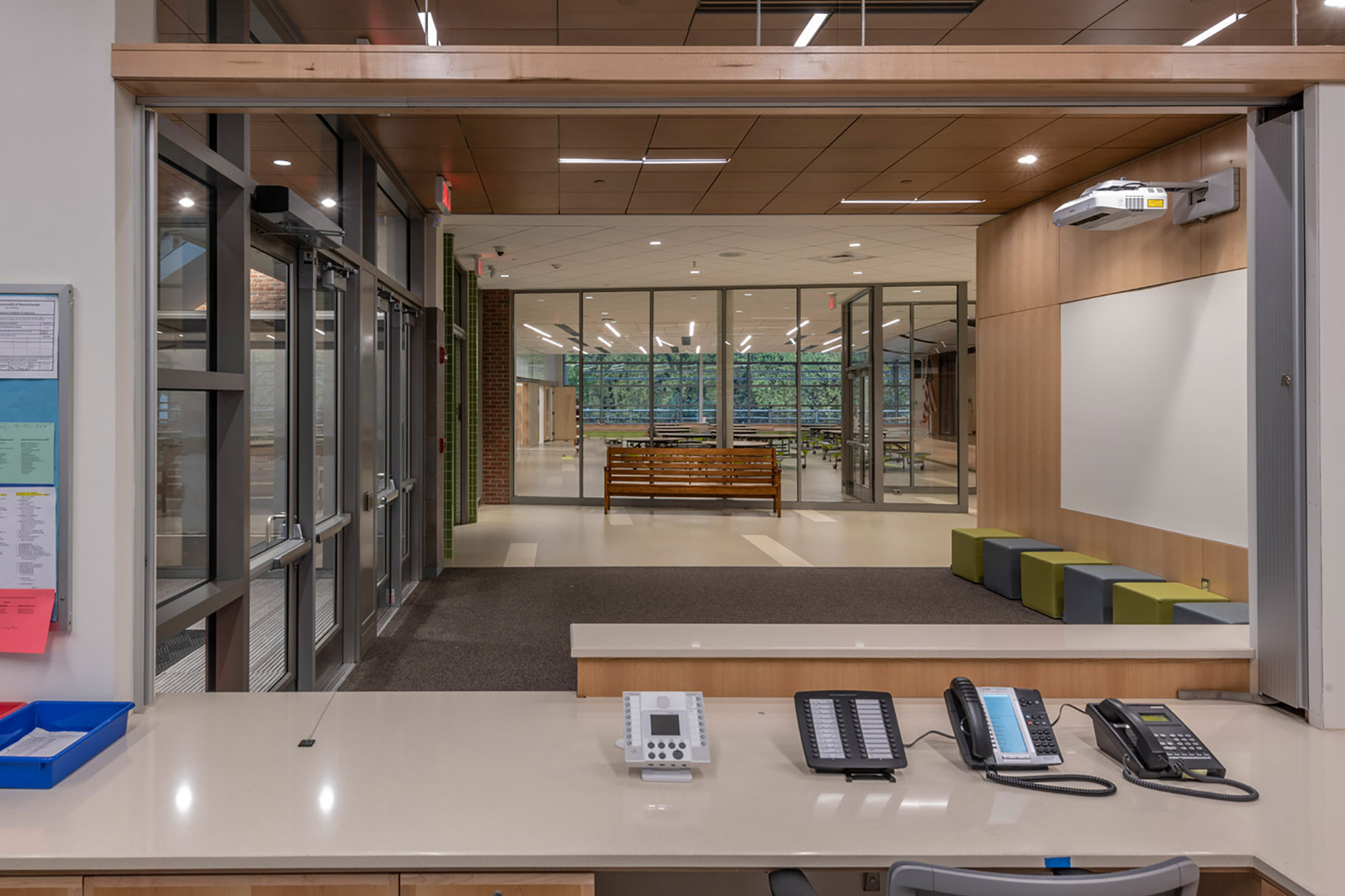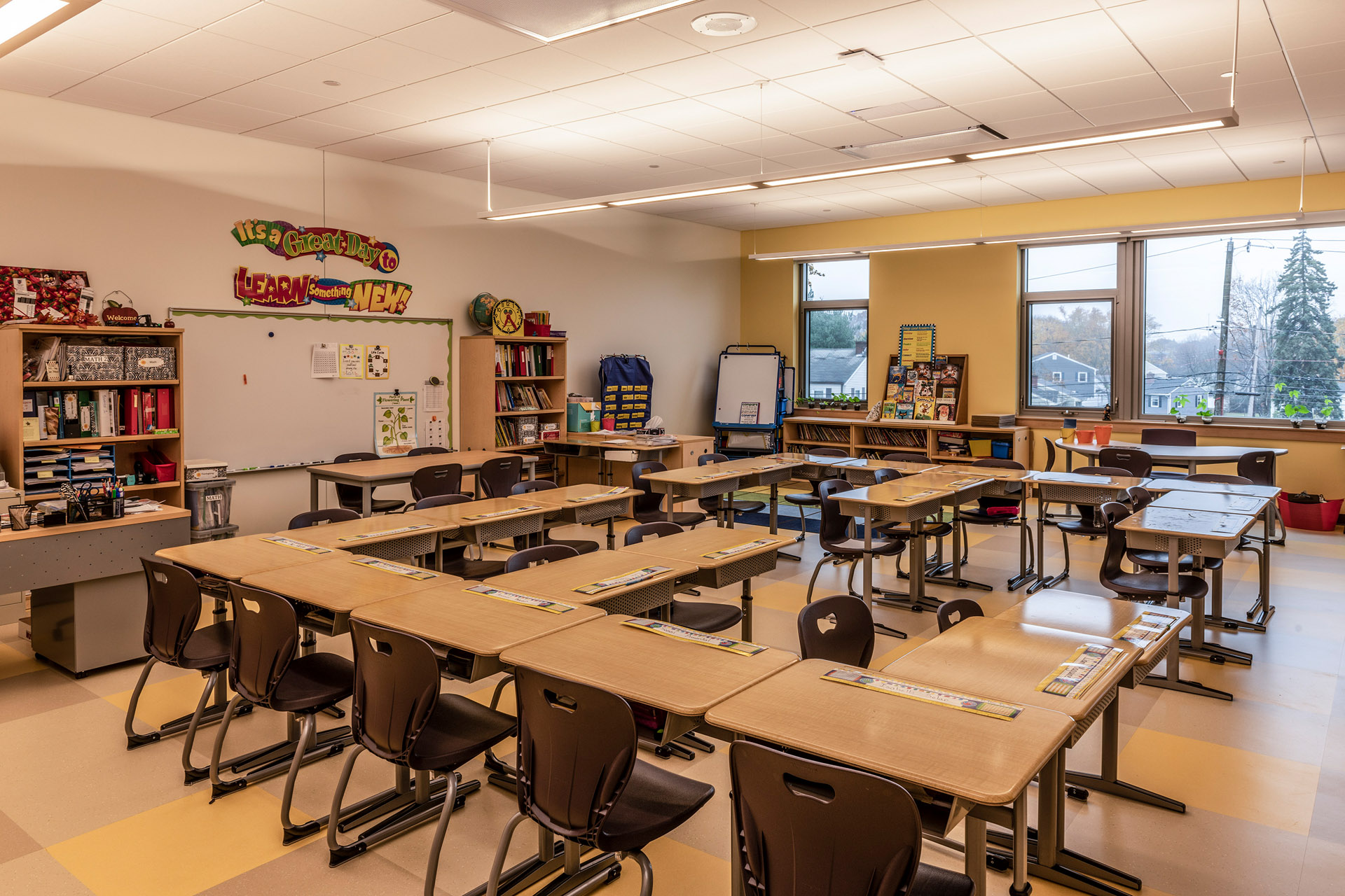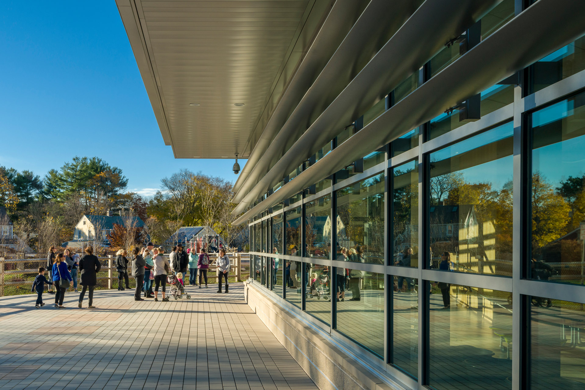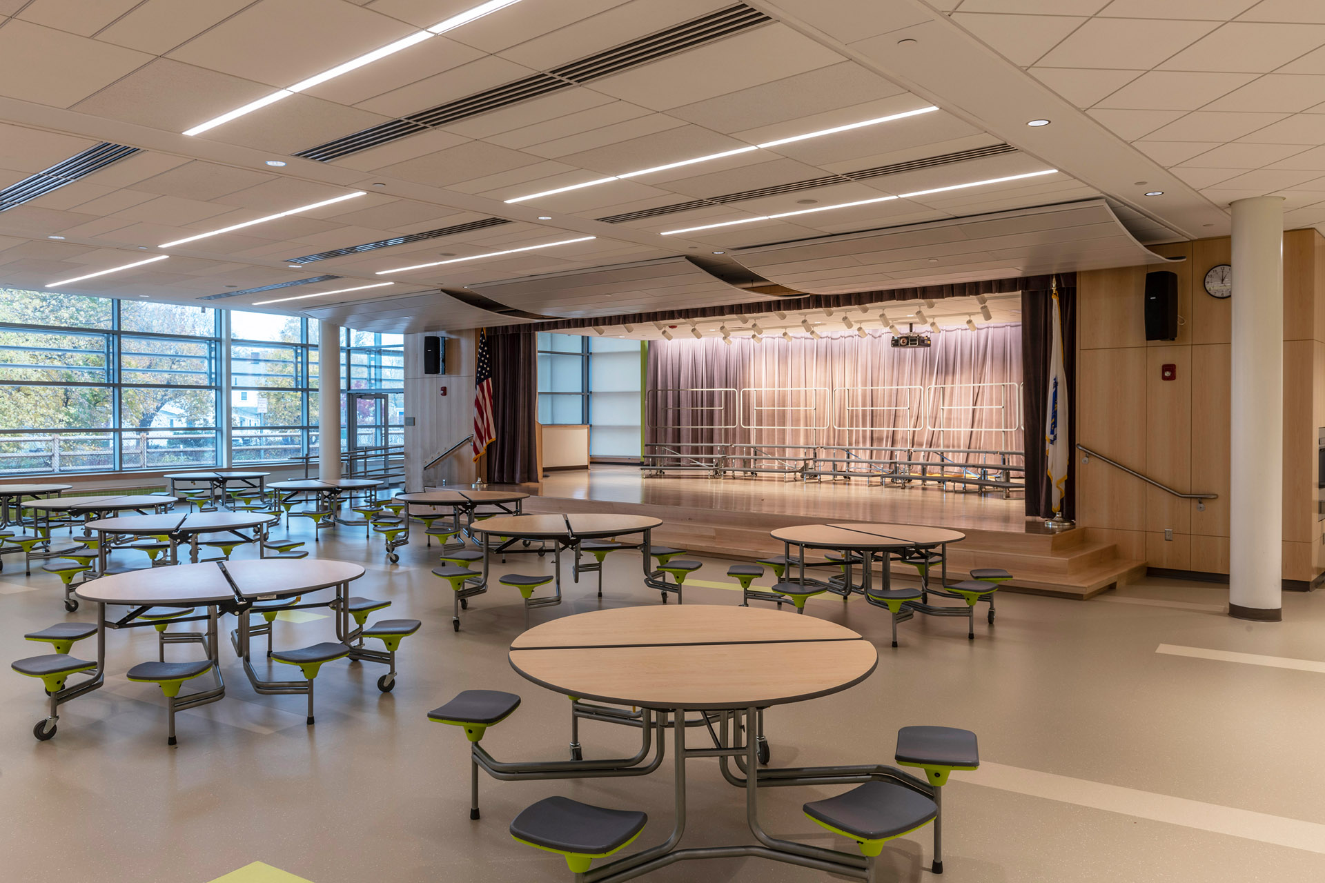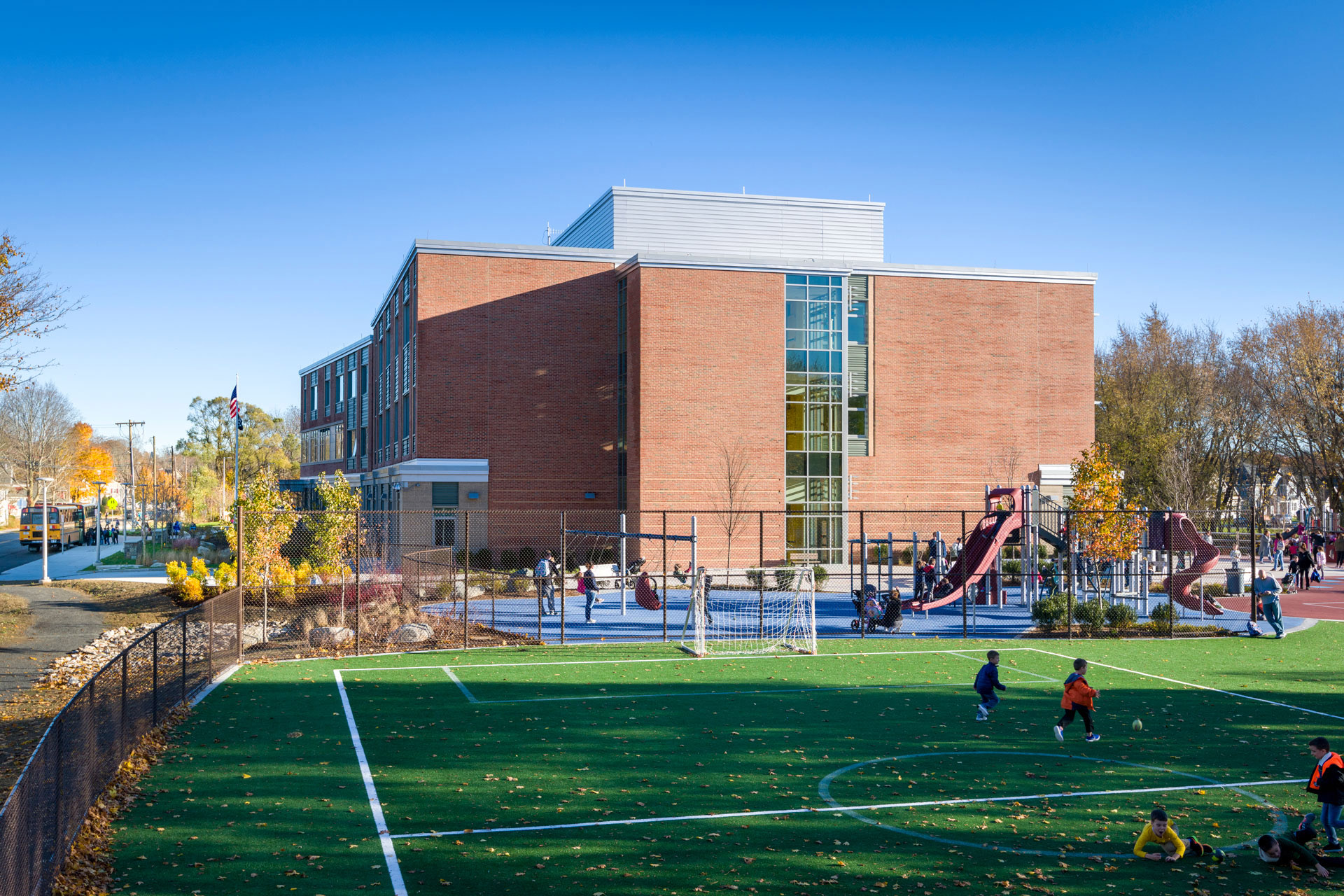 The new school building was constructed on a site that also contains a newly renovated farm stand. Its compact design helps to maintain the feel of a neighborhood school. The building has three-stories with academic areas clearly separated from the common spaces. The academic spaces feature project areas outside clusters of classrooms for student cubbies as well as additional small group instruction spaces. The administration area is optimally located at the point of entry, facing the front of the site, and central to school activities. The layout is compact and efficient, yet gracious, with beneficial views and solar orientation.