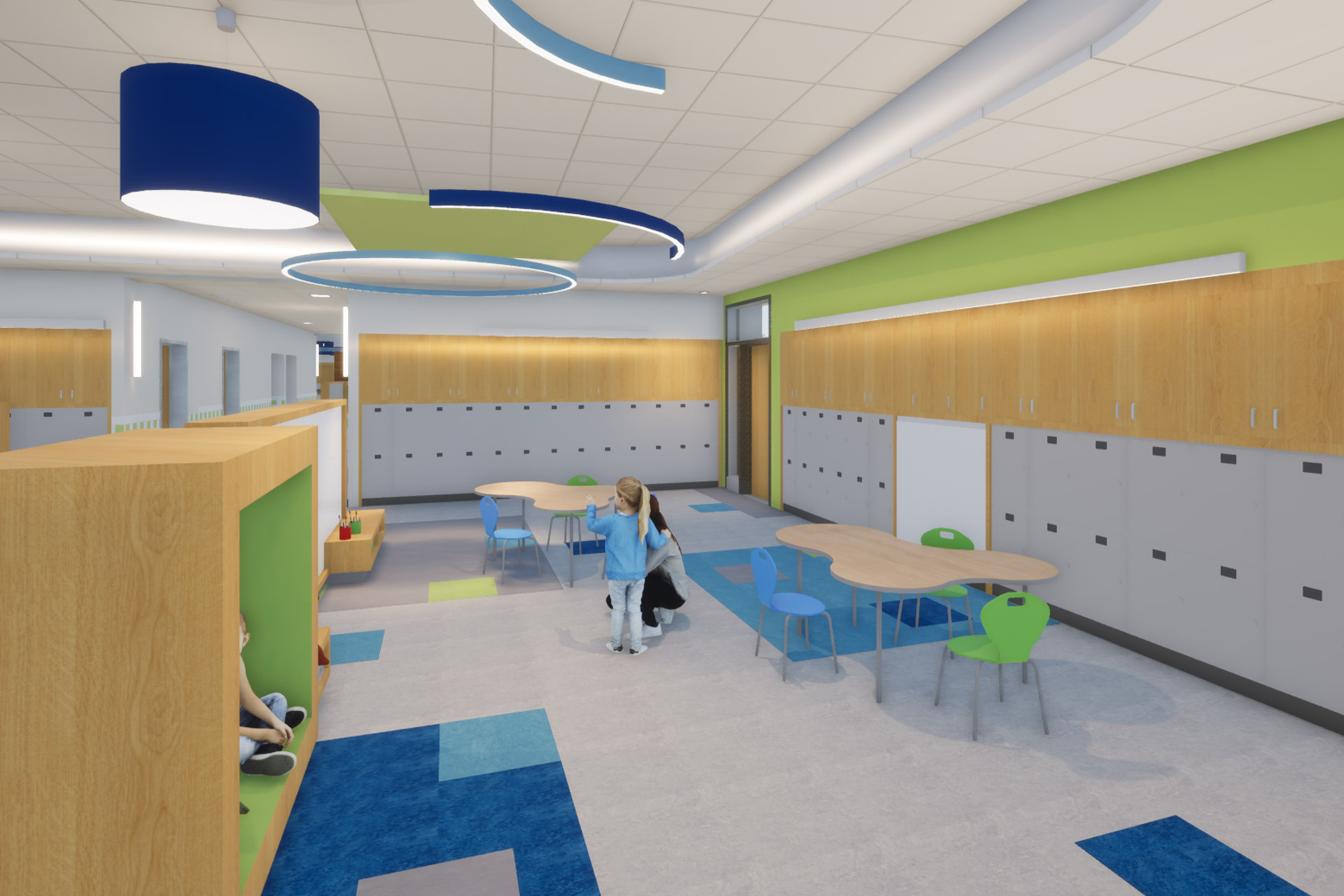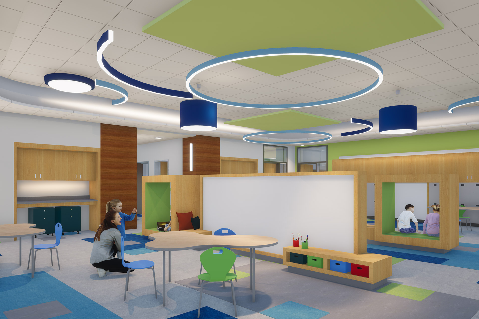The design takes advantage of its sloping site to minimize the building’s visible height, and incorporates transparency to provide natural light and allow the building to feel connected to its exterior environment. For a building of its size, the plan feels compact and easy to navigate; its minimal circulation space also functions as adaptive teaching spaces and project based learning in the form of project areas connected to groups of classrooms. There is also a “learning stair” that serves as a mini indoor amphitheater. The new school will incorporate the latest technology into its flexible design that will allow for curriculum changes as needed if future enrollment fluctuates.