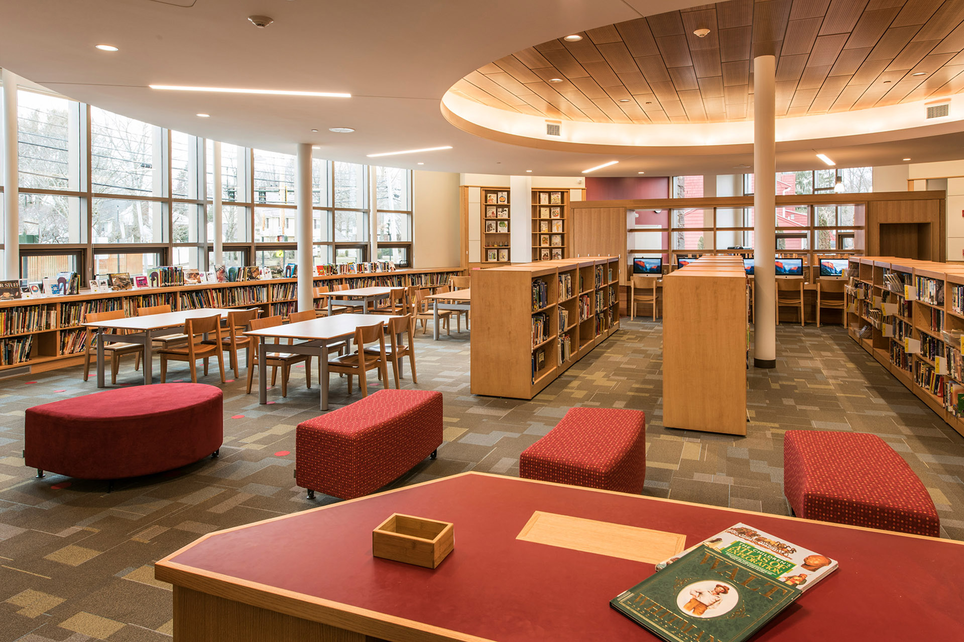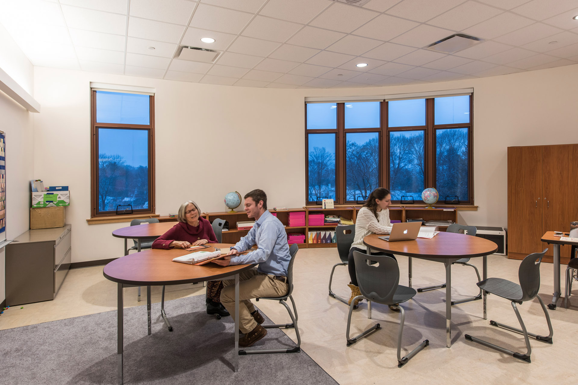 The school now features a plaza facing Beacon Street that can serve as both an early morning outdoor gathering space and an outdoor classroom. This plaza provides both an attractively landscaped interface with and a separation from the public street. Dropoff zones and pedestrian access are well resolved, with separate areas for buses and cars. The administration area is perfectly located at the point of entry, facing the plaza, and central to school activities. The program areas facing the public street and private abutters afford the opportunity for appropriately scaled fenestration and massing. The overall layout is compact and efficient, yet gracious, with beneficial views and solar orientation. The new cafeteria employs an ideal relationship to play areas, the stage, and music rooms. Kindergarten classrooms are on the second floor with the 1st and 2nd grades.