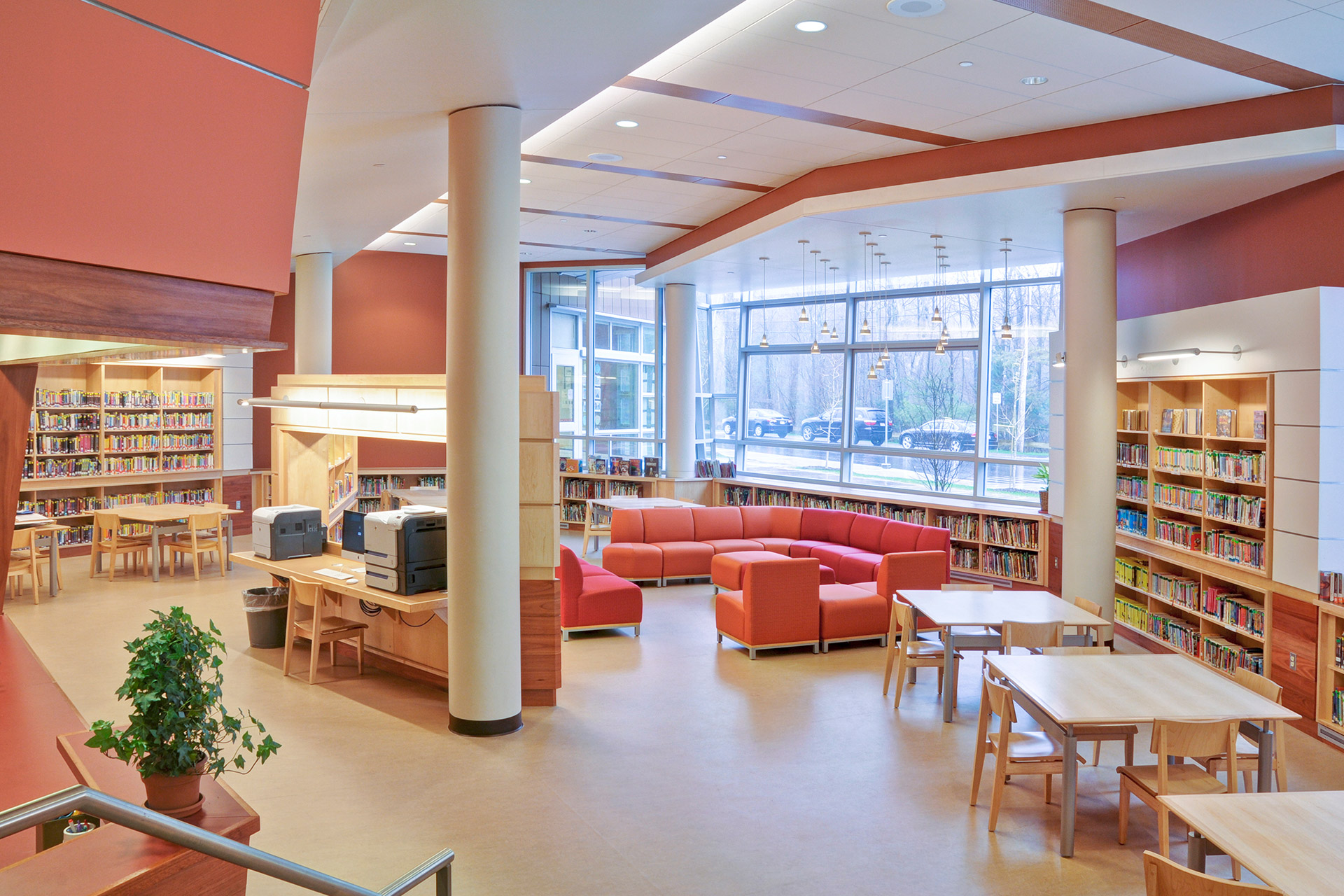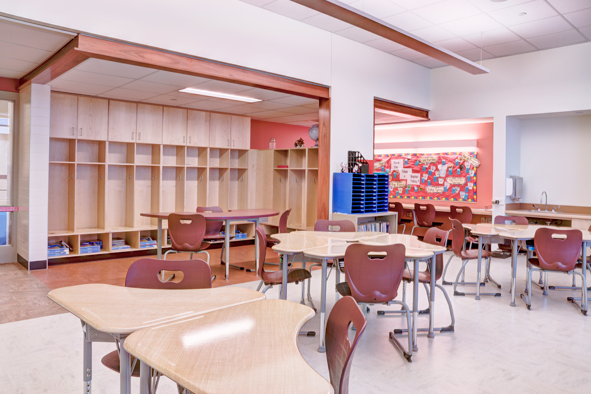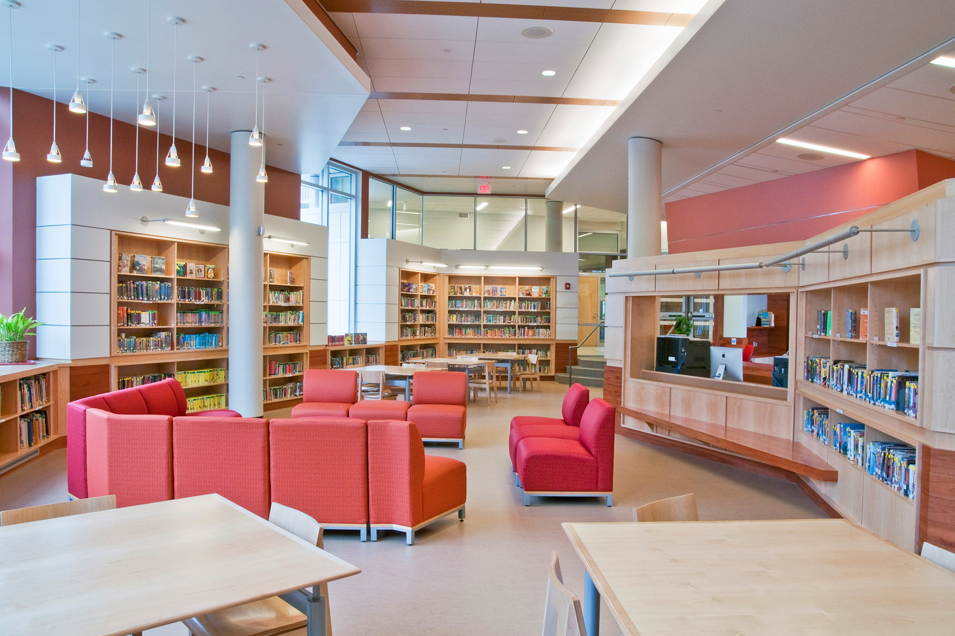 Upper levels of the school are classrooms while the first floor contains public, interactive spaces. The serene, quiet and engaging quality of the upper floors contrasts with the active, stimulating and vibrant environment of the first floor, which is designed in a playful, whimsical manner by accentuating more vivid materials, lighting, color, form, circulation patterns and intermittent nodes. Three stair towers highlight the entries.