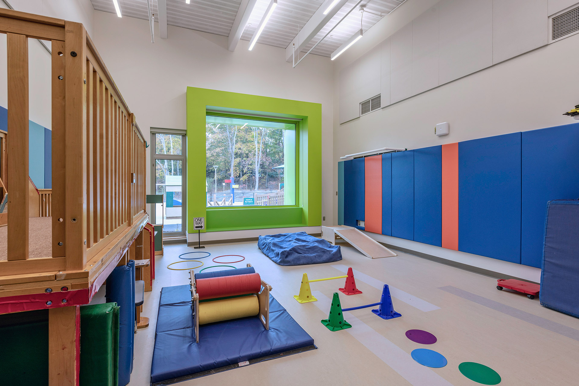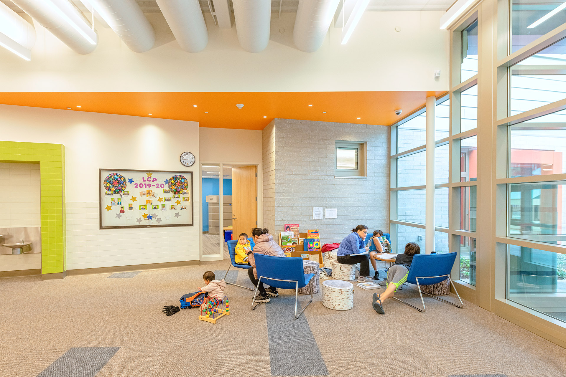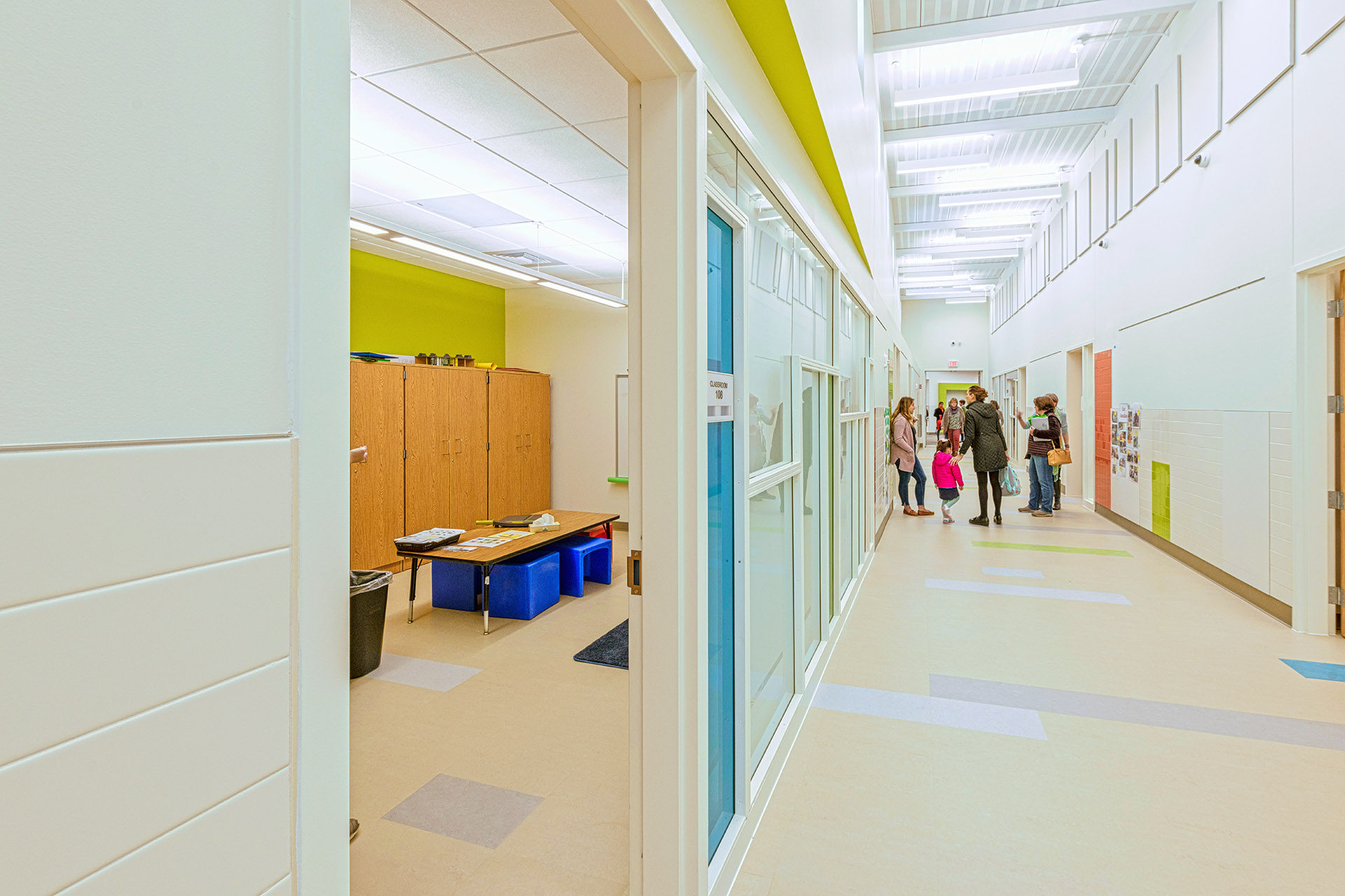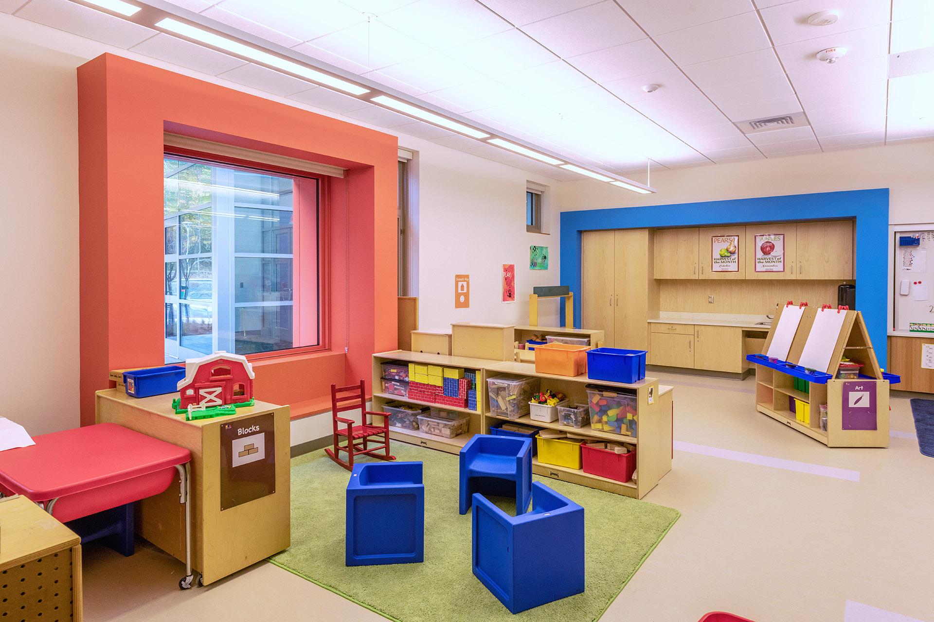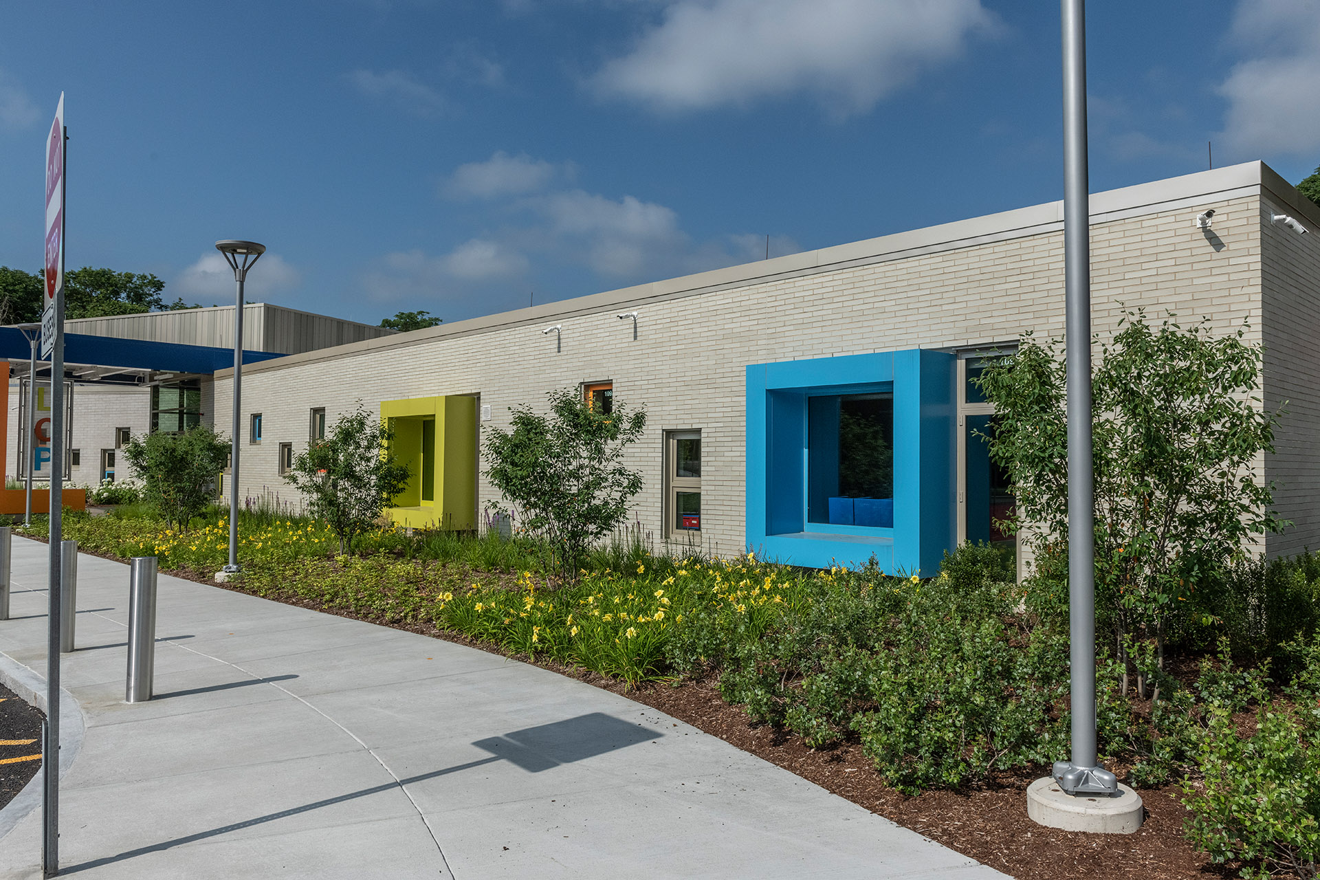 The building features a simple, barrier-free layout that focuses on student accommodation throughout. It has been thoughtfully designed to allow for future expansion should the program grow. Catering to students with specialized physical and developmental needs, generous double-height circulation spaces for openness, a family waiting area, and selective transparency allowing visible connection while maintaining privacy were design imperatives. Ceramic tile, bright finishes, and color accent the masonry building in a vibrant and cheerful manner without distracting students prone to overstimulation. Playfully oversized boxed windows are a feature of each classroom, connecting those spaces to the outdoors. Classrooms are designed to be stimulating and motivating with features that promote the physical, social-emotional, cognitive, and language development of each student.