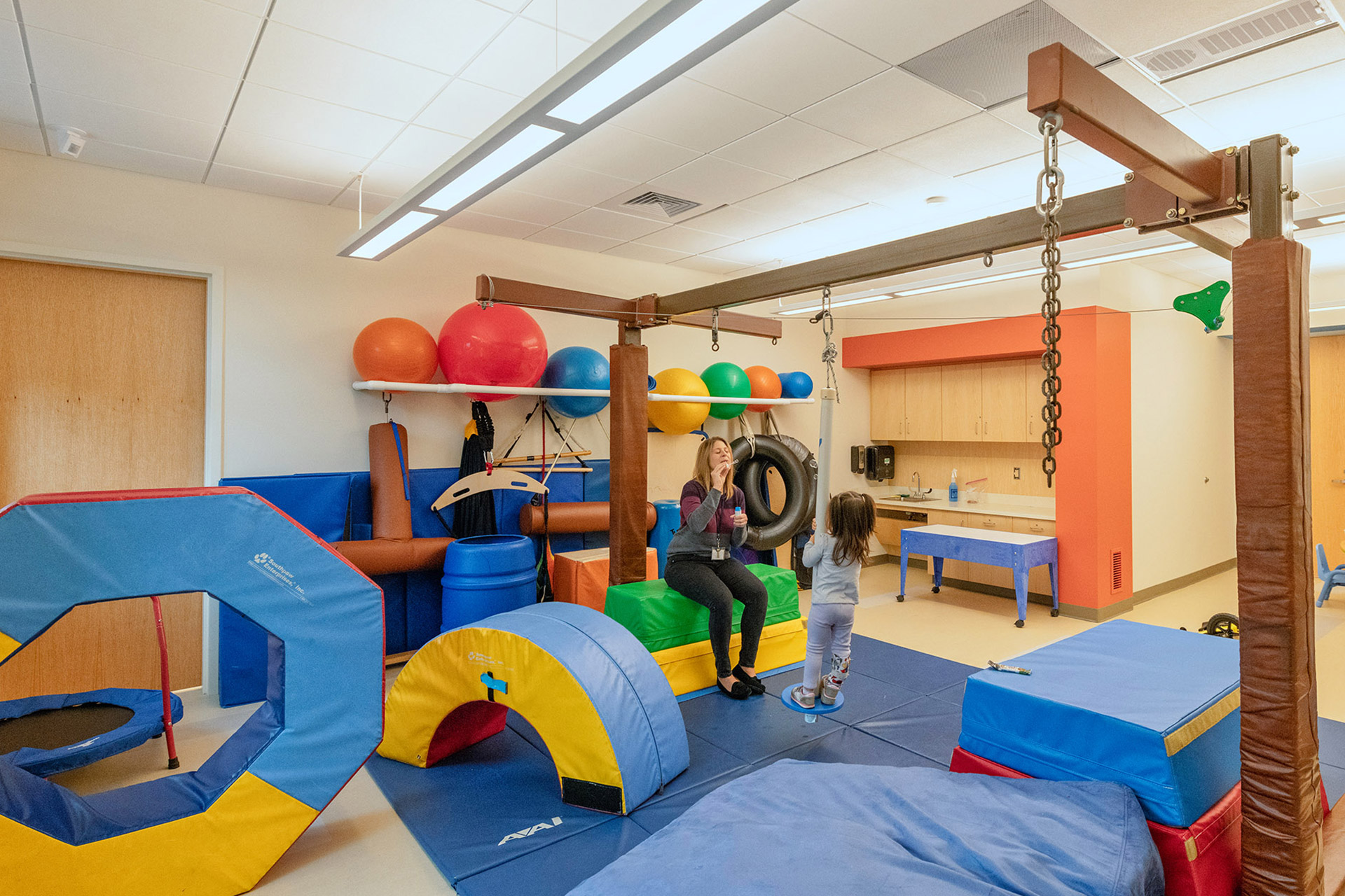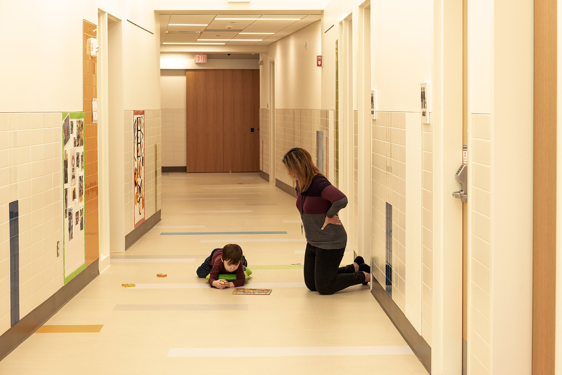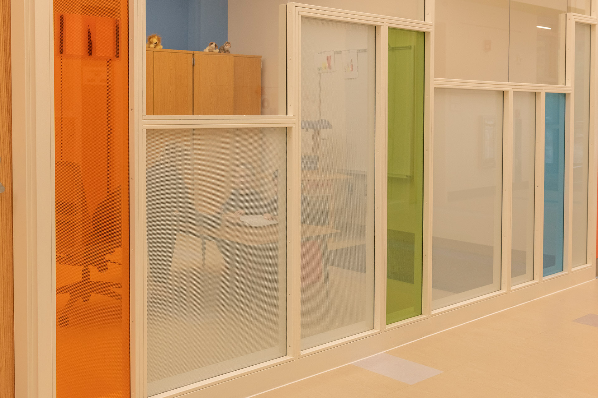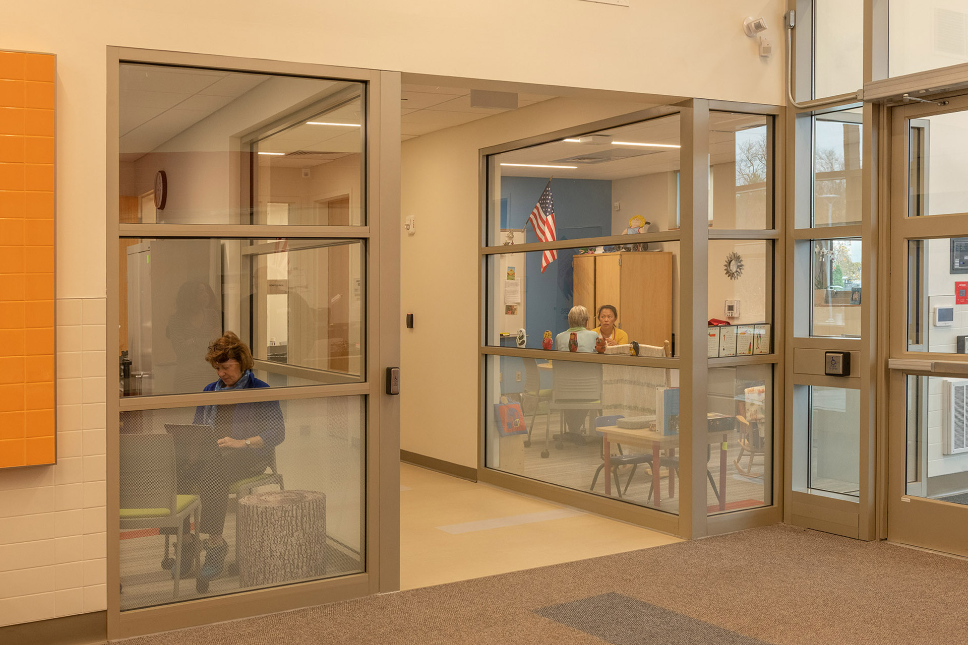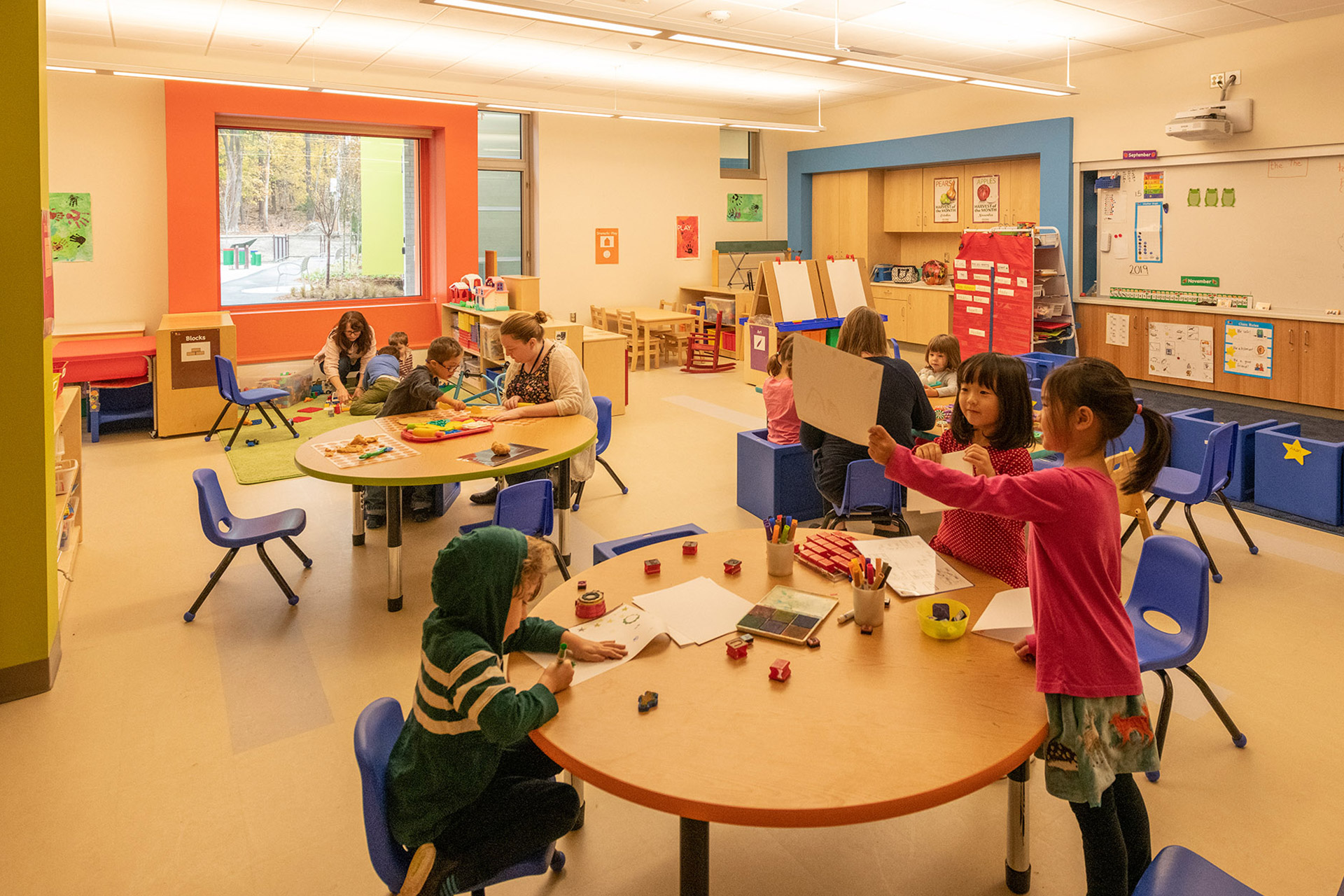 The building features a simple, barrier-free layout that focuses on student accommodation throughout. It has been thoughtfully designed to allow for future expansion should the program grow. Catering to students with specialized physical and developmental needs, generous double-height circulation spaces for openness, a family waiting area, and selective transparency allowing visible connection while maintaining privacy were design imperatives. Ceramic tile, bright finishes, and color accent the masonry building in a vibrant and cheerful manner without distracting students prone to overstimulation. Playfully oversized boxed windows are a feature of each classroom, connecting those spaces to the outdoors. Classrooms are designed to be stimulating and motivating with features that promote the physical, social-emotional, cognitive, and language development of each student.