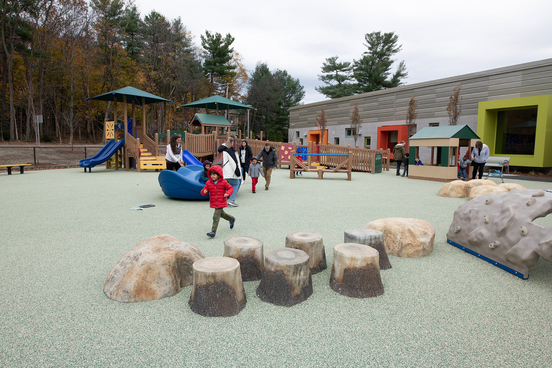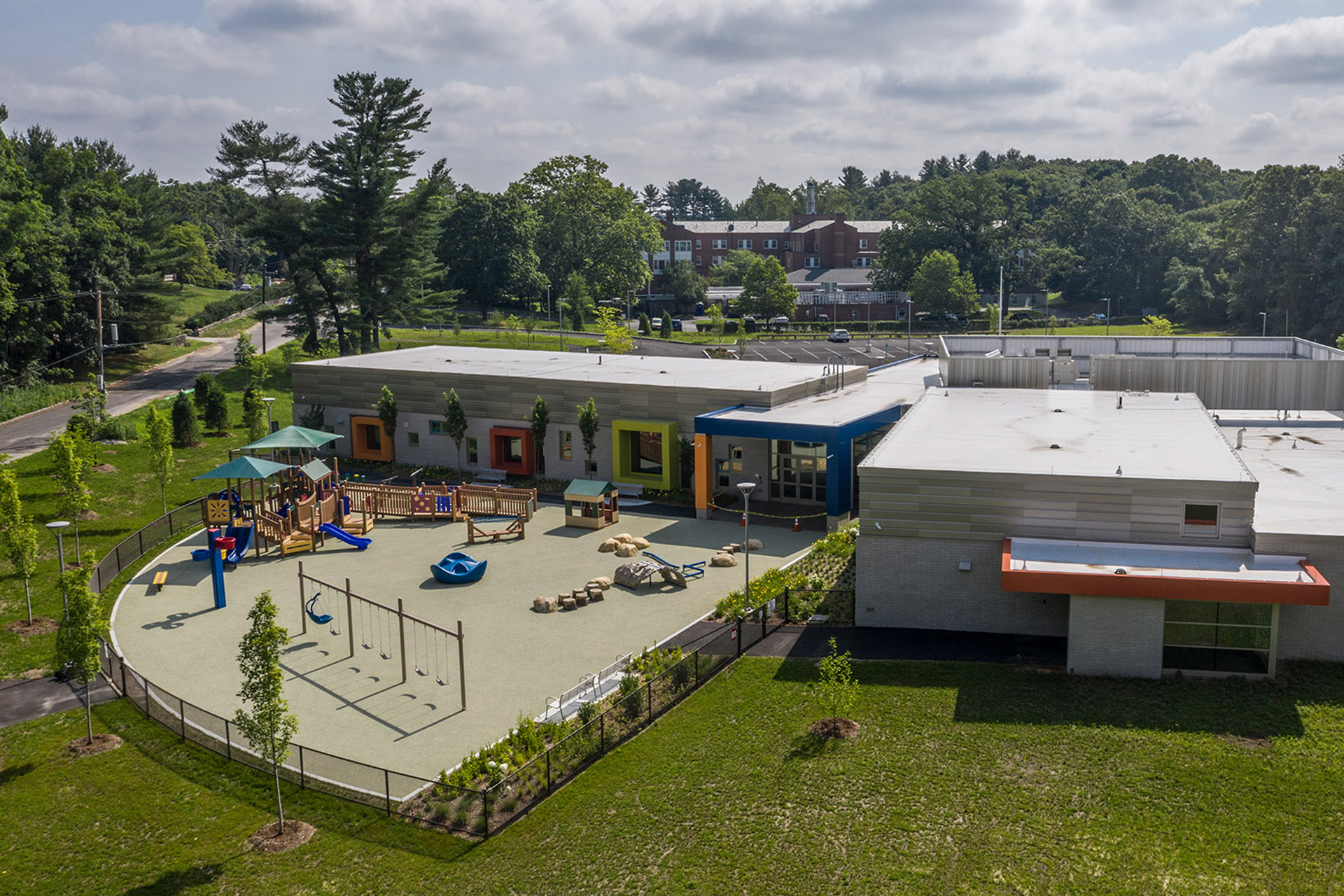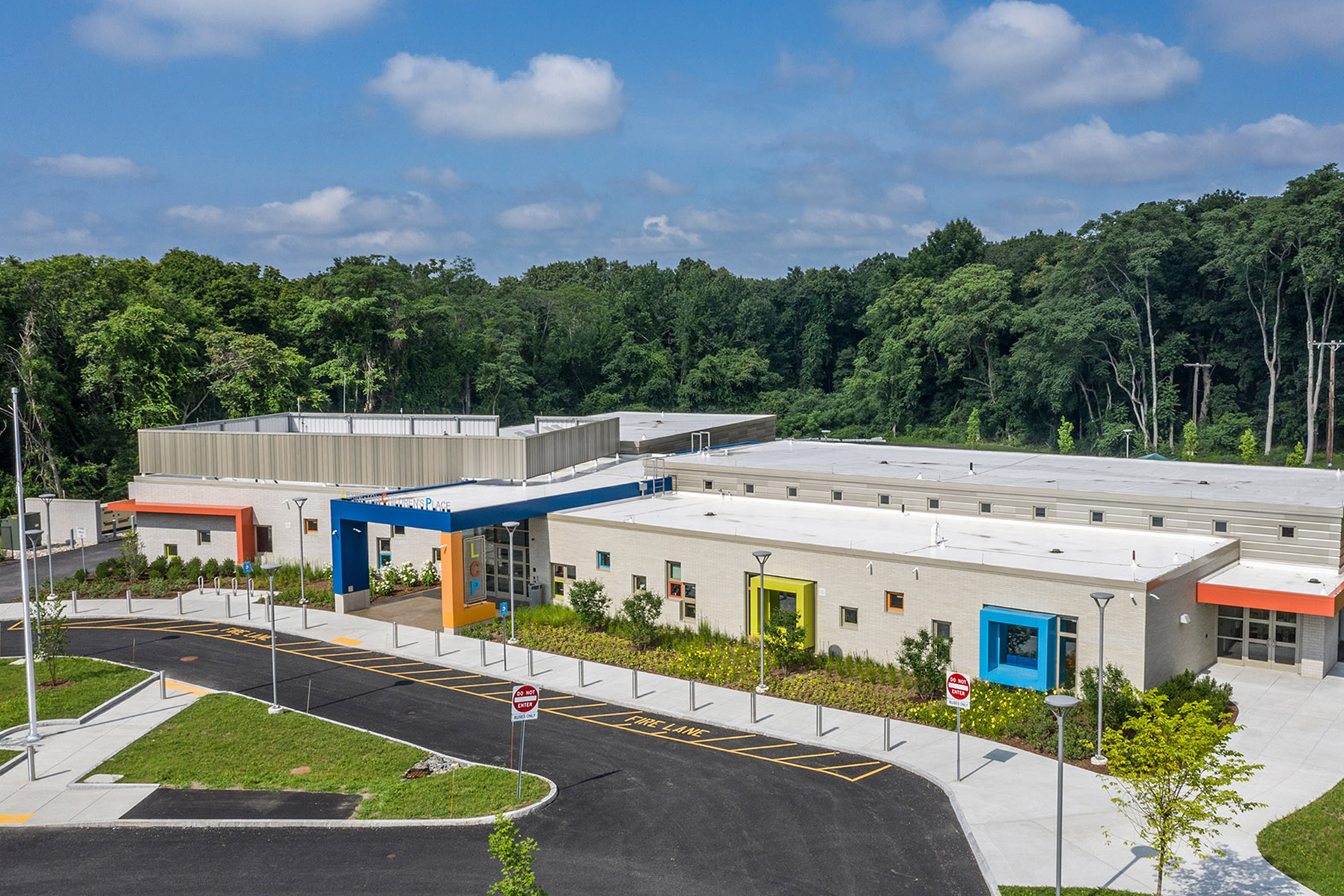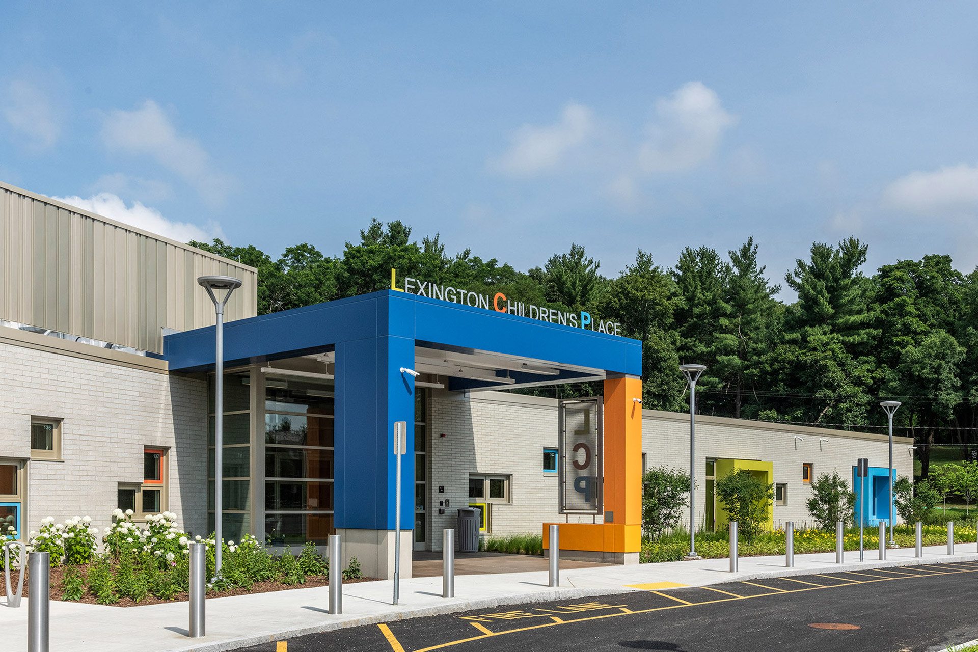 The LCP site is centrally located in town within a wooded area that provides a beautiful backdrop, and it benefits from the natural beauty of the wetlands and vegetation, with a generous secluded playground. An exhaustive study led to the demolition of an existing 1960s school to accommodate the facility, which was designed to support specific needs and influenced by the age and size of the students, appropriately scaling the building accordingly. An early enabling package allowed the building to be constructed in less than 10 months utilizing MGL Ch. 149.